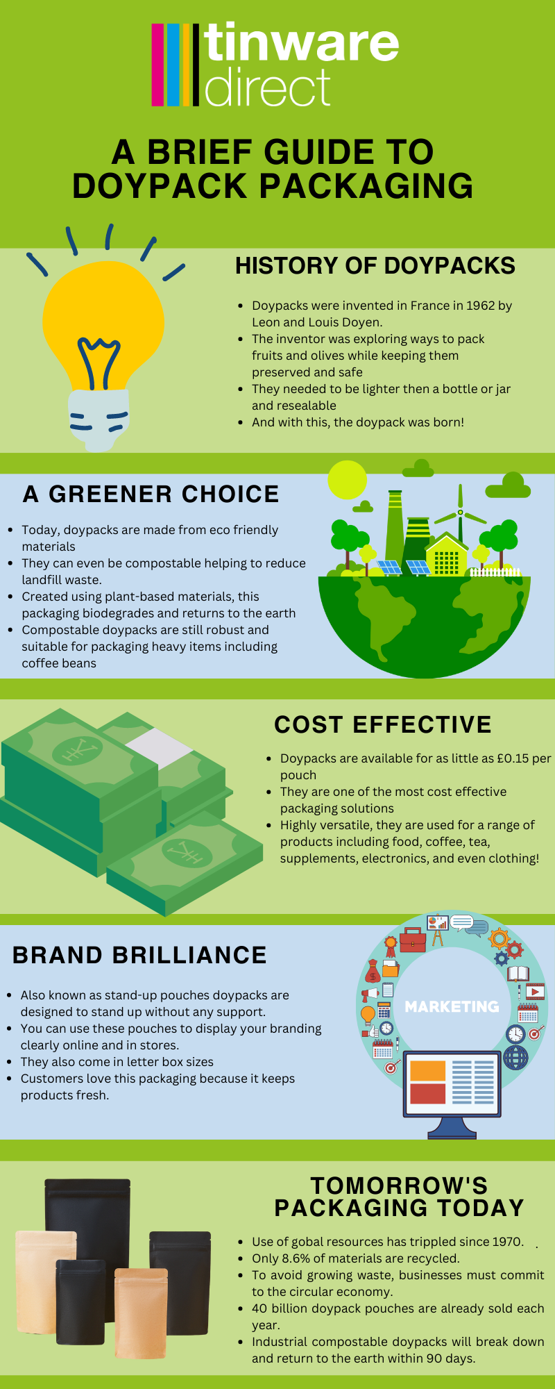 As you can see stand up pouches are a wonderful packaging option for any brand and the perfect fit for a company eager to be part of the circular economy. The infographic below provides even more information about doypacks and their unique advantages: